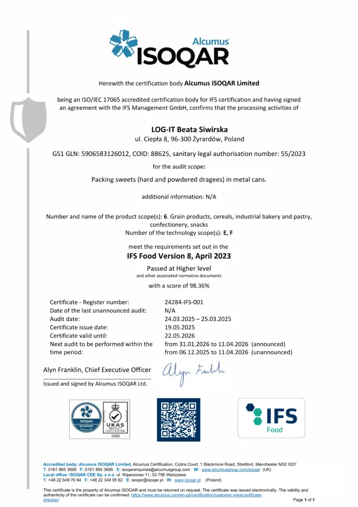 We are proud to announce that our company has been awarded the IFS Food Version 8 compliance certificate, May 2023, by ISOQAR. This prestigious certification validates our commitment to maintaining the highest standards in food safety management.